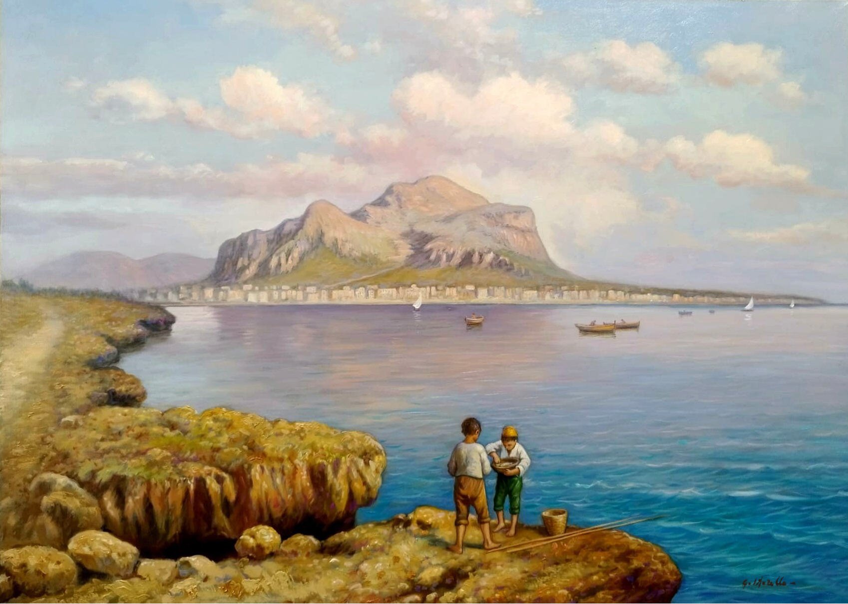 In un pittoresco paesaggio siciliano, alcuni bambini sono intenti a pescare sulla riva. In primo piano, piccoli scogli affiorano dall'acqua poco mossa, creando un mosaico naturale. Un grande scoglio in secondo piano domina la scena, imponente e maestoso. Sullo sfondo, montagne avvolte dalla foschia si innalzano abbracciando il mare, mentre barche a vela veleggiano placidamente. Il cielo è coperto di nuvole, conferendo un'atmosfera suggestiva e tranquilla alla scena.