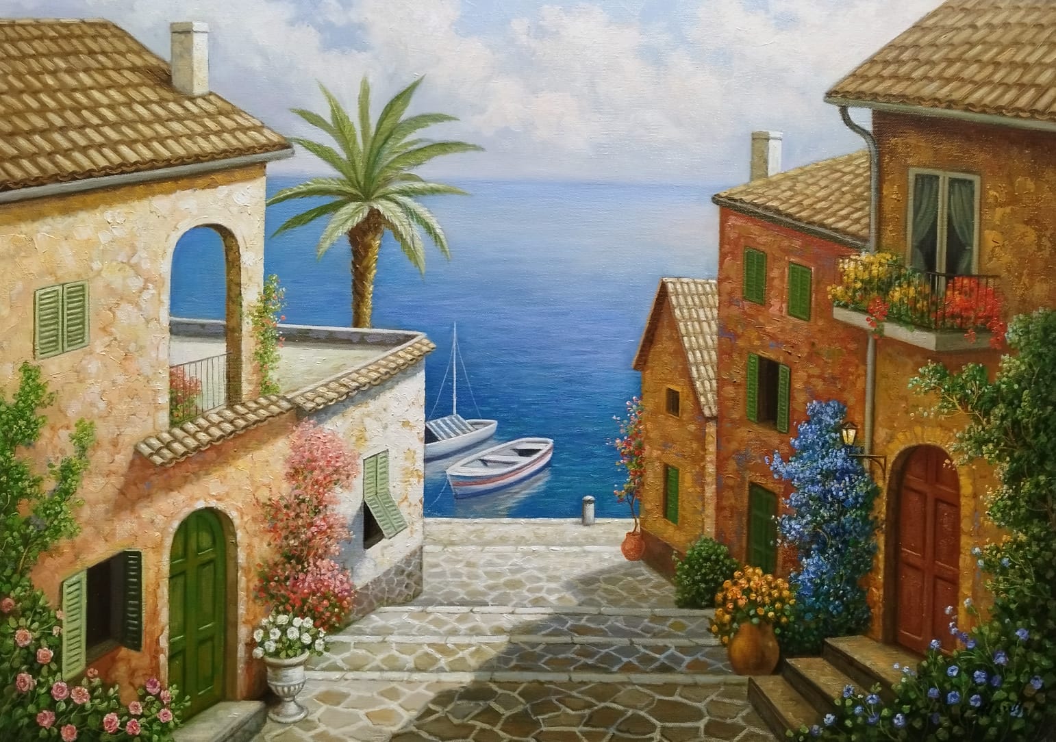 Questo dipinto rappresenta un tipico borgo siciliano affacciato sul mare, caratterizzato da edifici in pietra con tetti di tegole rosse, che trasmettono un’atmosfera rustica e tradizionale. Le case sono disposte su livelli sfalsati, collegate da una scalinata in pietra che crea un senso di profondità. Le facciate sono arricchite da fioriere e piante rampicanti che aggiungono un tocco di colore e vitalità al borgo. Sullo sfondo si intravede il mare blu con alcune vele bianche, simbolo di serenità e libertà. La scena è illuminata da una luce calda e naturale, tipica del Mediterraneo.