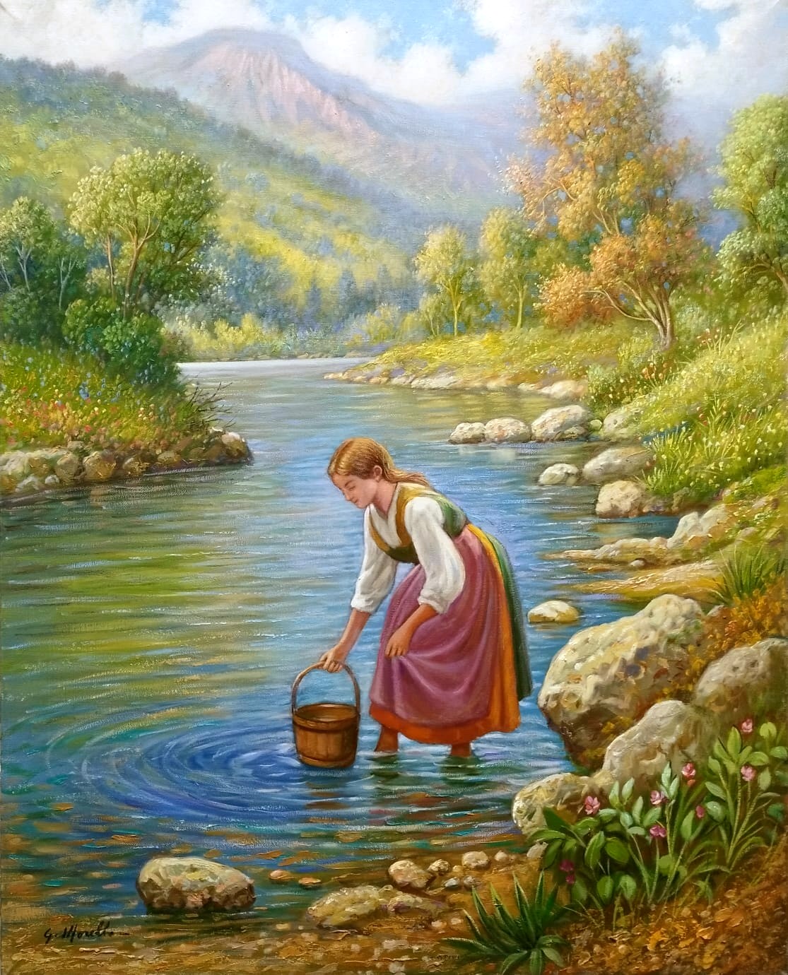 In questo paesaggio sereno, grandi alberi secolari dominano la scena, le loro chiome dense e folte si stagliano verso il cielo e sembrano avvolgere il luogo con una presenza maestosa. In primo piano, un gruppo di mucche si prepara ad attraversare un piccolo corso d'acqua, il quale scorre placidamente tra ciottoli e rive erbose, riflettendo i colori del cielo e della vegetazione circostante. Le mucche, rilassate e abituate al paesaggio, si muovono con lentezza e tranquillità, creando una scena di profonda pace rurale. Più in lontananza, una giovane pastorella accompagna con cura una mucca. Il loro passo si dirige verso il cuore della scena, fondendosi in modo naturale con l'ambiente. Oltre il limite degli alberi, si intravedono montagne in lontananza avvolte da una foschia, che dona al paesaggio una sfumatura misteriosa e suggestiva.